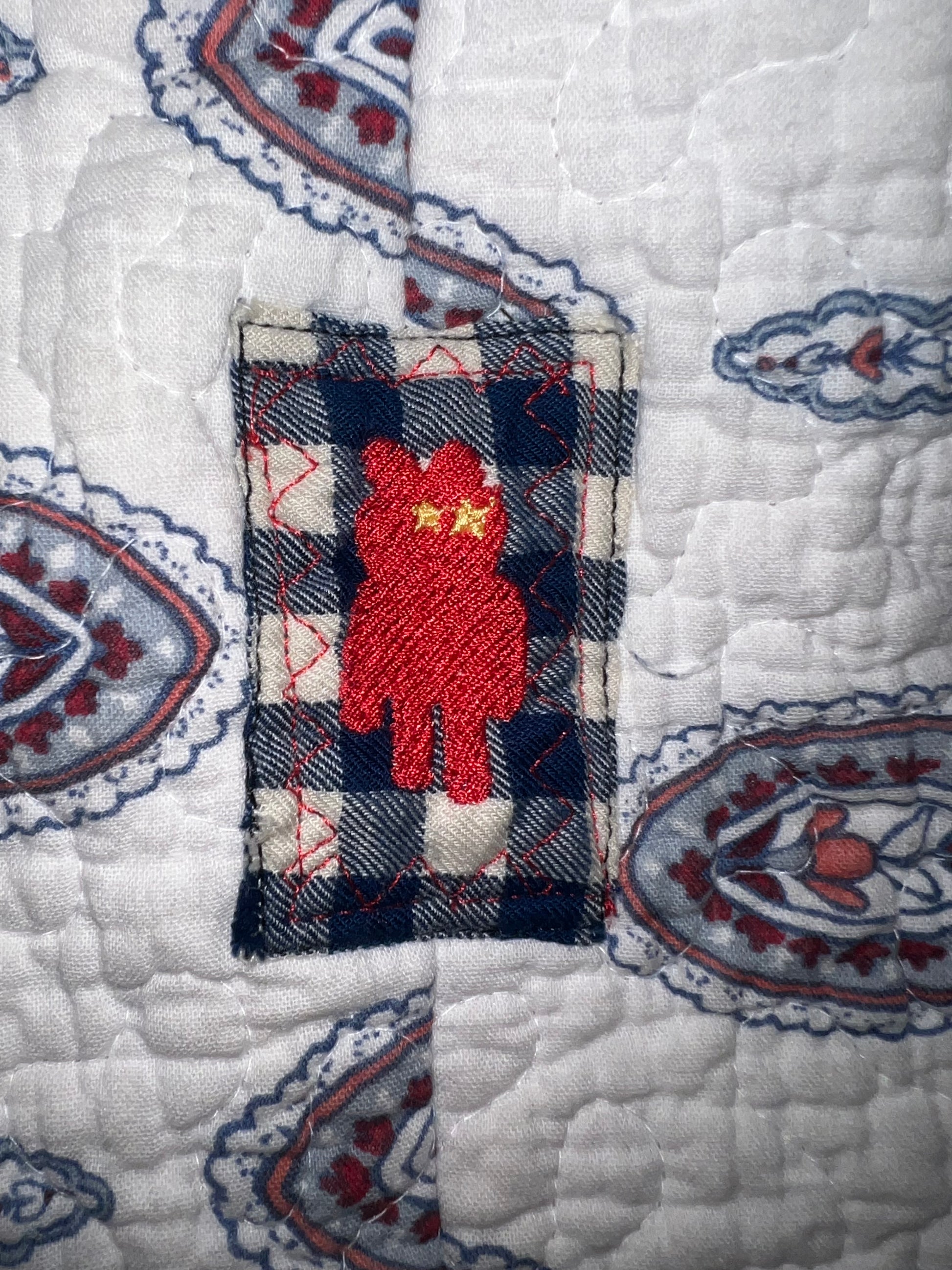 Up-cycled balaclava with bunny ears and a repurposed flannel embroidered logo patch.
